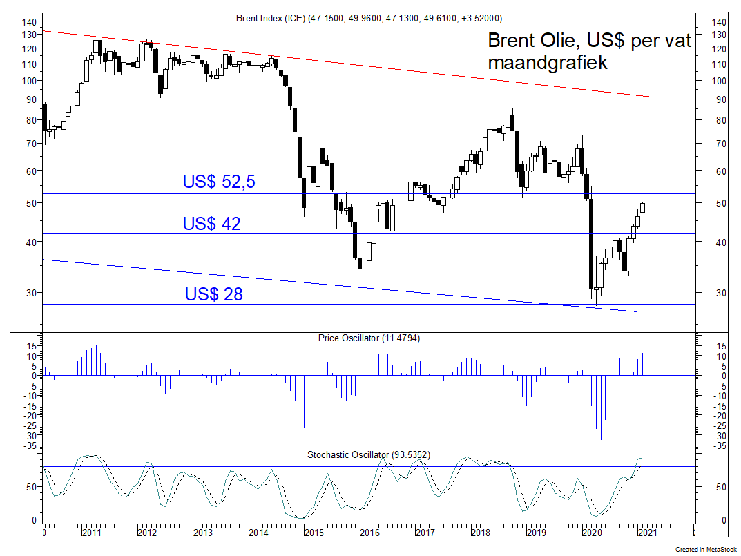 We naderen de bovenkant van de tradingrange van US$ 33 en US$ 52,5 voor Brentolie. Deze bandbreedte houden wij al enige tijd vast en voorlopig zien wij geen aanleiding om hier van af te wijken. De vraag naar olie moet eerst drastisch aantrekken en / of de $ moet flink verder dalen voordat deze range in onze verwachting zal worden verlaten (aan de bovenzijde dan wel). En tot die tijd zijn de grote olie-majors vooral interessant als dividendbetalers. Deze rallyEen fikse stijging van het koersniveau die volgt op een daling of op een consolidatie. Copyright Vladeracken lijkt in elk geval toe aan een volgende adempauze.