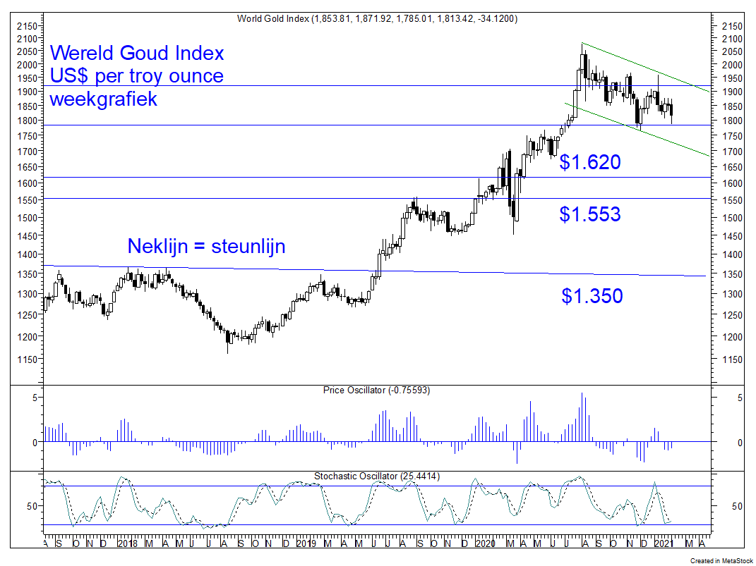 Goud, in $’s gemeten, is al enkele maanden aan een correctieEen daling van de koersen met van tenminste 10%. Copyright Vladeracken bezig en die correctieEen daling van de koersen met van tenminste 10%. Copyright Vladeracken is nog niet voorbij. Er tekent zich een keurig vlagpatroon omlaag af, en dat is een zogenoemd “continuatiepatroon”. Wij gaan er vanuit, dat de bodemDieptepunt in de koersontwikkeling. Men onderscheidt onder andere de dubbele, de triple, de broadening, de V en de extended bodem. Eén van de manieren om de aanwezigheid van een bodem vast te stellen is de volgende regel: iedere koers welke voorafgegaan wordt door drie hogere en gevolgd wordt door twee hogere slotkoersen, kan beschouwd worden als een bodem. Copyright Vladeracken van dit correctiepatroon nog niet bereikt is. Een daling tot tussen US$ 1.620 en US$ 1.553 is goed denkbaar en niets om van te schrikken. Want de lange termijn trendDe richting van de markt. Een opwaartse trend wordt gekarakteriseerd door een opeenvolging van hogere bodems en hogere toppen. Een neerwaartse trend wordt gekarakteriseerd door een opeenvolging van lagere bodems en lagere toppen. Copyright Vladeracken is stijgende en daar doet dit patroontje niets aan af, integendeel, het zorgt voor de broodnodige rust in het patroon, het stoot kopers af, het zorgt ervoor dat veel speculanten de handdoek in de ring gooien en het creëert daarmee ruimte voor de volgende sprong omhoog.