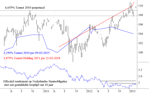 Twee zaken vallen in deze figuur op. De koersen van alle drie de obligaties zijn gestegen vanaf het moment dat in Duitsland de aansprakelijkheid ter discussie kwam en is geregeld. De stijging is niet alleen daarvan afhankelijk, want in die periode daalde ook de lange rente in (Noord) Europa getuige de rentegrafiek in het onderste deel van de grafiek. Maar in 2011, toen de problemen bij TenneT zichtbaar werden, daalde de koers(en) terwijl in die fase de lange rente ook daalde (zie de grafiek van de 10-jaarsrente onderin de figuur) en dat is tegenstrijdig. Dat kan alleen maar betekend hebben dat beleggers het risicoDit wordt wel berekend als het product van de standaarddeviatie van de waardeontwikkeling van een portefeuille (aandeel) en de mutatiegraad op jaarbasis binnen deze portefeuille (van dit aandeel). Copyright Vladeracken dat aan TenneT is verbonden hoger begonnen in te schatten. Maar de koersen zijn inmiddels terug op het niveau van juli 2010 terwijl de 10-jaarsrente in Nederland daar maar fractioneel onder ligt, dus obligatiebeleggers zijn kennelijk weer helemaal gerustgesteld.